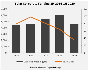 $1.2 billion in funding was made in residential and commercial solar energy projects during the first half of 2020 and there were 25 solar corporate merger and acquisitions compared to just 37 during the first half of 2019.