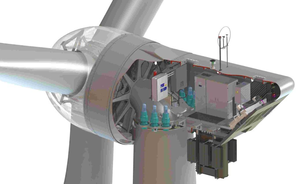The WEG turbine also includes the transformer in the nacelle, rather than at the tower base. This transformer steps up the 925 volts generated by the alternator to 33kV, reducing losses through more efficient energy transmission. There is also then no need for a separate transformer and its associated infrastructure at ground level.