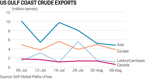 US crude exports to Asia fell to 4.74 million barrels last week, from 5.17 million barrels the week ending August 2, and 10.02 million barrels the week ending July 5, according to cFlow, Platts trade flow software.