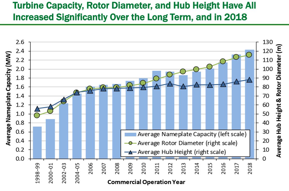 The continued and dramatic cost reductions are still being achieved in the American wind energy sector, through an embrace of bigger and taller wind turbine designs, which have on average doubled in height over the last 20 years and seen blade lengths grow by more than 50 per cent.