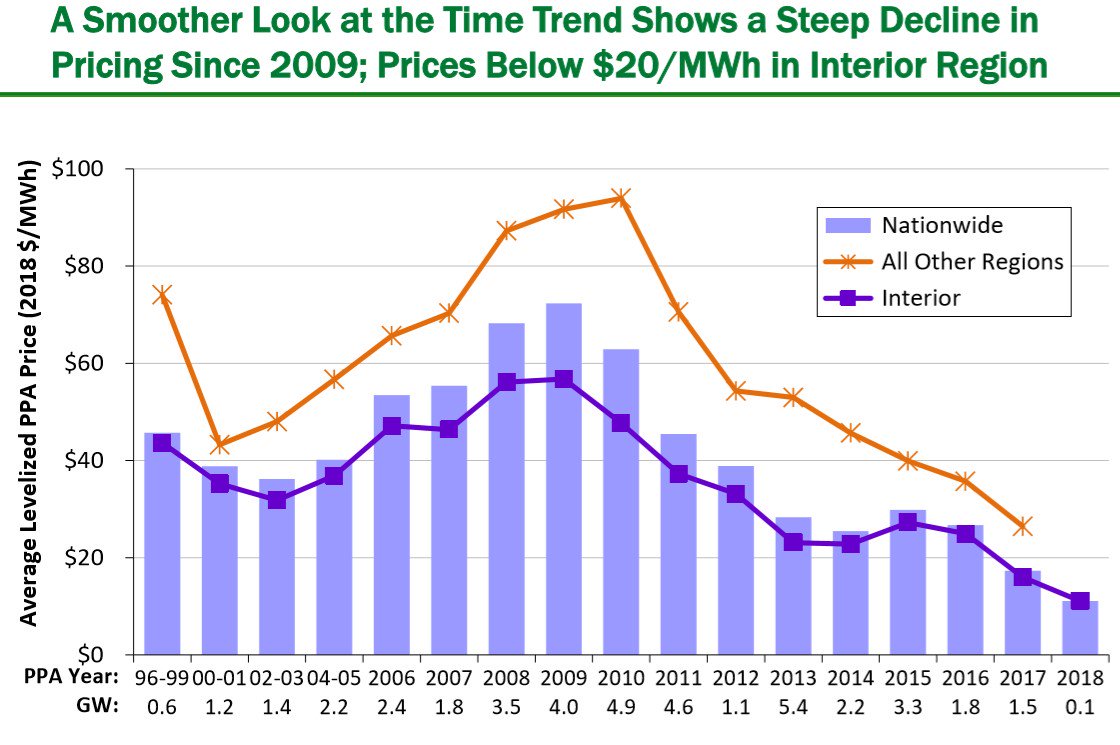 On a levelised cost basis, wind power is still reaching record lows in the United States, with the average price of new power purchase agreements dropping below 2 cents per kWh for the second year in a row.
