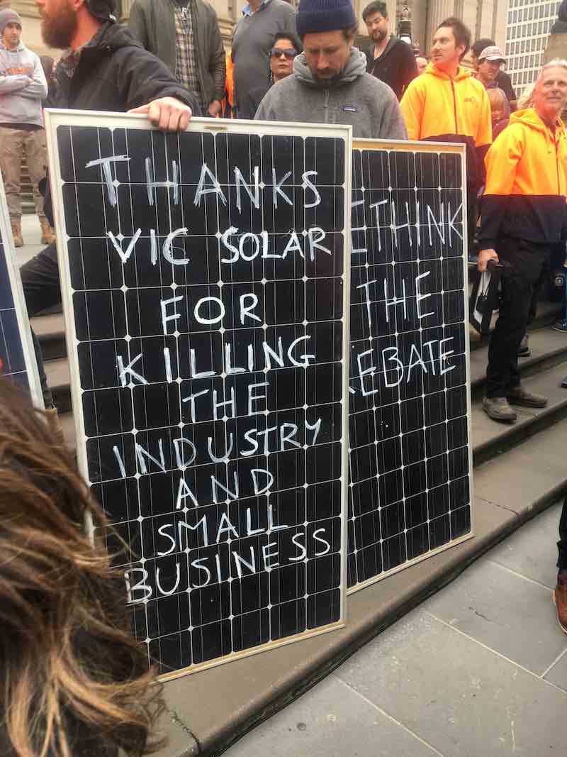 That demonstration – and a second rally outside the Premier’s office last week – saw hundreds of industry members gather to protest a scheme they say has brought non-rebate installations to a halt in the state, forcing job cuts and driving some businesses into liquidation.
