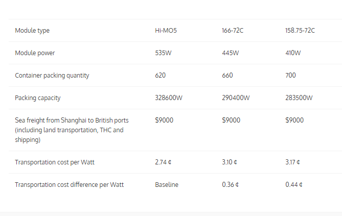 In terms of transportation costs, Hi-MO 5 has obvious advantages over other mainstream products available in the market. Taking this 7MW project in the UK as an example, based on current shipping rates, the transportation cost for Hi-MO5 modules to the UK can be reduced by 0.36 ¢ /W when compared with the shipping cost for 72C modules based on 166mm wafers, as can be seen in the tables below: