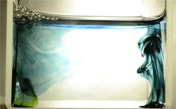 The researchers addressed these problems through the use of a gas-attracting surface placed in close proximity to the catalyst material. This material is a specially textured "gasphilic," superhydrophobic material that repels water but allows a smooth layer of gas called a plastron to stay close along its surface. It keeps the incoming flow of carbon dioxide right up against the catalyst so that the desired carbon dioxide conversion reactions can be maximized. By using dye-based pH indicators, the researchers were able to visualize carbon dioxide concentration gradients in the test cell and show that the enhanced concentration of carbon dioxide emanates from the plastron.