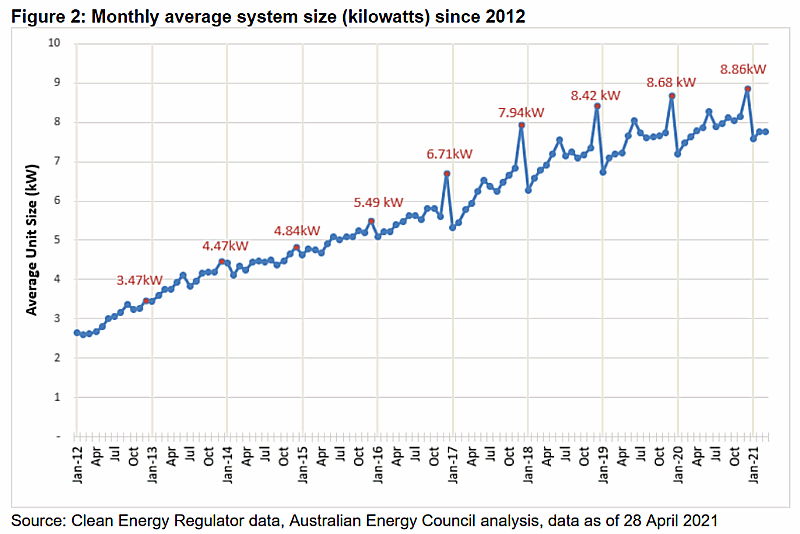 A report published last Thursday by the Australian Energy Council (AEC) noted the average capacity of small-scale systems (<100kW) reached a new peak of 8.86kW for installations in December last year. Small-scale includes systems not only installed for households, but also for businesses.