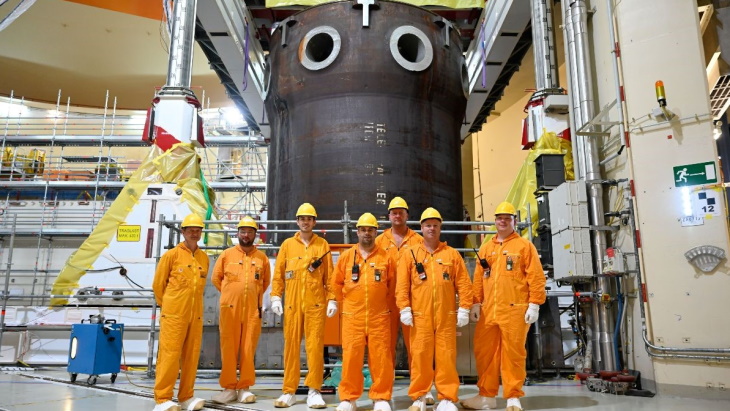 The reactor pressure vessel was pulled 3.55 metres by the team of powerlifters: Yuri Kuzmin, Yegor Sorokaletov, Evgeny Osipov and Alexey Islentyev. At a grand total of 452 tons, the vessel and its trolley weighed the equivalent of 75 elephants.