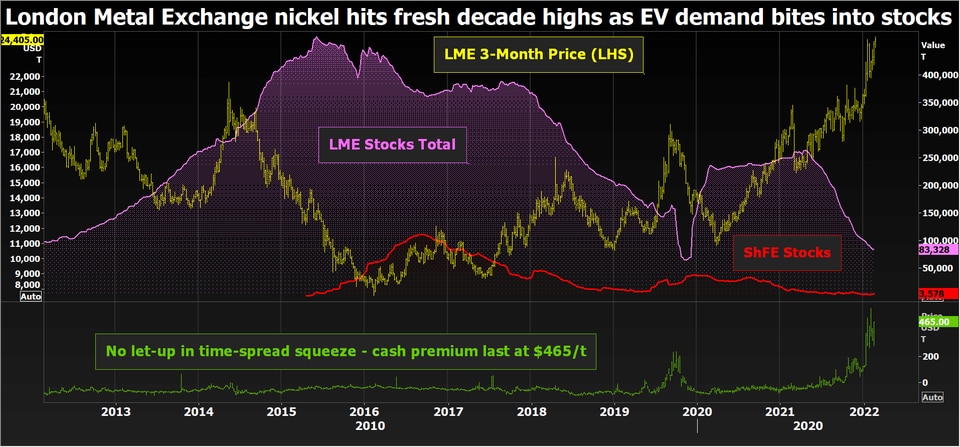LME nickel hits fresh decade highs as battery demand bites into stocks