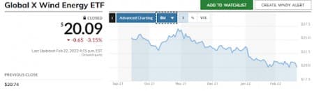 GlobalX ETF Wind Energy, (NYSE:WNDY) and First Trust Global Wind Energy, (NYSE:FAN), were two that popped up on a quick search. Both have similar slopes, only natural since they invest in many of the same companies (Orsted, Vestas, etc.), so I’ll present only one. WNDY is down 25% in the last since months and trends toward further weakness.