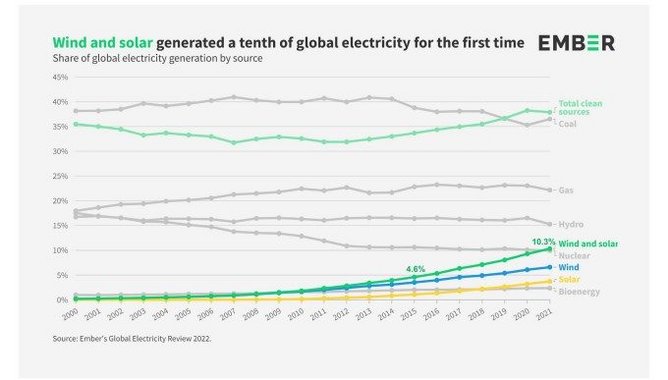 Wind and solar generated over a tenth (10.3%) of global electricity for the first time in 2021, rising from 9.3% in 2020, and twice the share compared to 2015 when the Paris Climate Agreement was signed (4.6%), according to a new report from Ember.