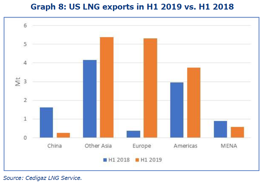 The United States (US)-China trade war has not prevented US developers from investing in new liquefaction trains so far but without China’s equity or contracts: out of the seven LNG export projects sanctioned between October 2018 and August 2019, three are in the US. However, since the imposition by China of a 10% tariff on US LNG in retaliation to US tariffs on Chinese goods, Chinese imports of US LNG have collapsed.