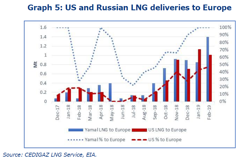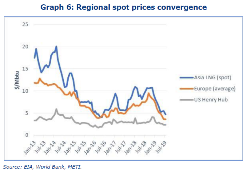 Europe has now become a premium market for Atlantic LNG suppliers. European LNG imports have surged, notably LNG imports from the US, but also from Russia’s Yamal LNG. The surge in LNG imports has depressed European spot prices, which have collapsed to ten-year lows in June 2019.