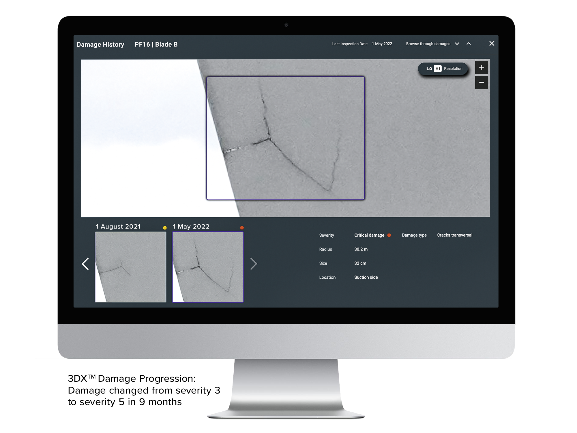 The new 3DX™ Damage Progression module allows users to compare damages which have been recorded during previous inspections with new inspection data. Thanks to the user-friendly interface, the progression of a damage is displayed in a time series of recorded inspections, so that it can be easily evaluated. In this way, leading-edge erosion for example, can be closely monitored and its evolution tracked in a so-called “damage chain”.
