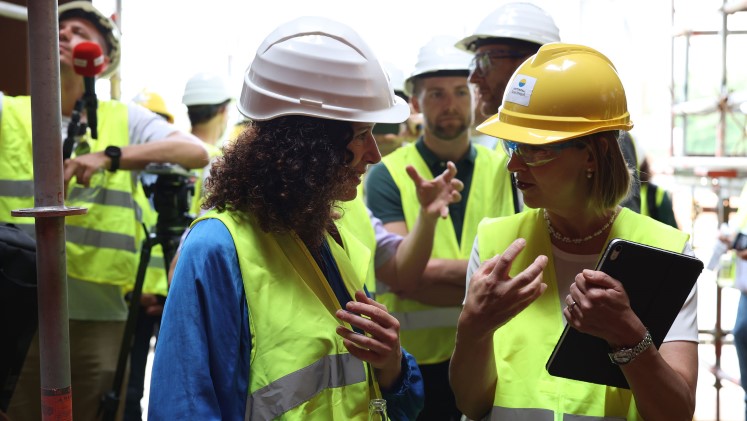 The heat accumulator on Vattenfall's site at the Reuter West CHP plant in Berlin is expected to be commissioned at the start of next year. It should take up to two months to fill the impressive hot water tank with a volume equivalent to around 350,000 bathtubs. The CEOs of Vattenfall Wärme Berlin AG, Tanja Wielgoß, and the Berlin environmental senator, Bettina Jarasch, assessed the situation at the site on 30 June before the heat accumulator was due to be filled for the first time.