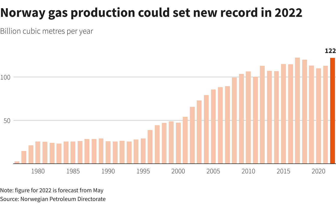 The Nordic country is expected to produce some 122 billion cubic metres (bcm) of gas this year, according to official forecasts made in May, an increase of 8% from 2021, possibly beating a record set five years ago.