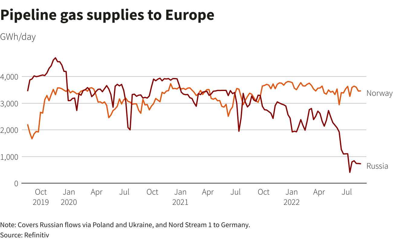 Norway is now Europe's biggest supplier of gas, according to Refinitiv Eikon data, overtaking Russia, which has cut back on its gas deliveries.