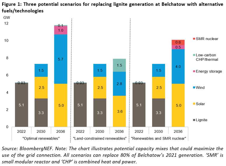 BNEF has found that deploying 11GW of wind and solar in the region to replace 80% of Belchatow’s brown coal generation is possible from a land-use perspective. Alternatively, some 6GW of wind and solar paired with a gas, biomass or waste-to-energy plant could achieve similar output.