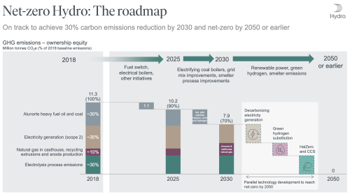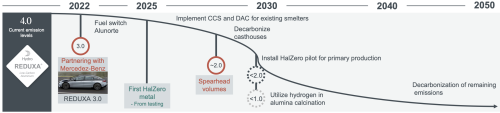 Mercedes-Benz will collaborate with Norwegian aluminum producer Hydro to reduce significantly the CO₂ footprint of aluminum in the automotive supply chain. Hydro and Mercedes-Benz will from 2023 to 2030 collaborate on a joint technology roadmap aiming to develop aluminium solutions approved for automotive applications with a CO2 footprint below 3.0 kgCO2/kgAl. The ambition is to approach near-zero aluminum by end of the same time period.