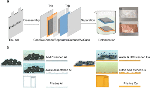 (a) Reclamation of Al and Cu current collectors from end-of-life lithium-ion battery cells; (b) different treatments for electrode delamination from current collectors. Zhu et al.