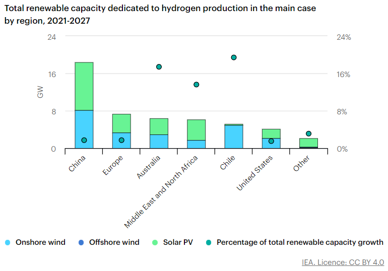 For 2022-2027, the main case forecasts around 50 GW of renewable capacity to be dedicated to hydrogen production, accounting for 2% of total renewable capacity growth. China leads expansion, followed by Australia, Chile and the United States. Together, these four markets account for roughly two-thirds of dedicated renewable capacity for hydrogen production.