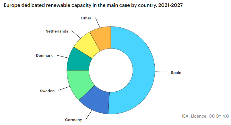 Meanwhile, Europe is expected to deploy 7 GW of dedicated renewable capacity for hydrogen production during 2022-2027, encouraged by decarbonisation goals and, more recently, the need to strengthen energy security by displacing Russian gas. Spain is in the lead, accounting for half of Europe’s growth, followed by Germany, Sweden, Denmark and the Netherlands. The main drivers are ambitious electrolyser goals, supported by financial incentives. While the European Union is considering setting an electrolyser target of 44 GW by 2030, REPowerEU modelling scenarios suggest that 65‑80 GW would be required to decrease Russian gas imports.