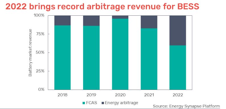 As can be seen from the chart below, in previous years, energy arbitrage contributed an average of 12% to total BESS market revenue, with the remainder coming from frequency control ancillary services (FCAS). In 2022, the energy arbitrage share jumped to 40%.