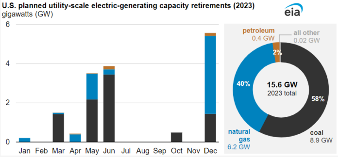 According to the Department of Energy’s Energy Information Administration (EIA), US operators plan to retire 15.6GW of electric-generating capacity in 2023, mostly natural gas-fired (6.2GW) and coal-fired (8.9GW) power plants.
