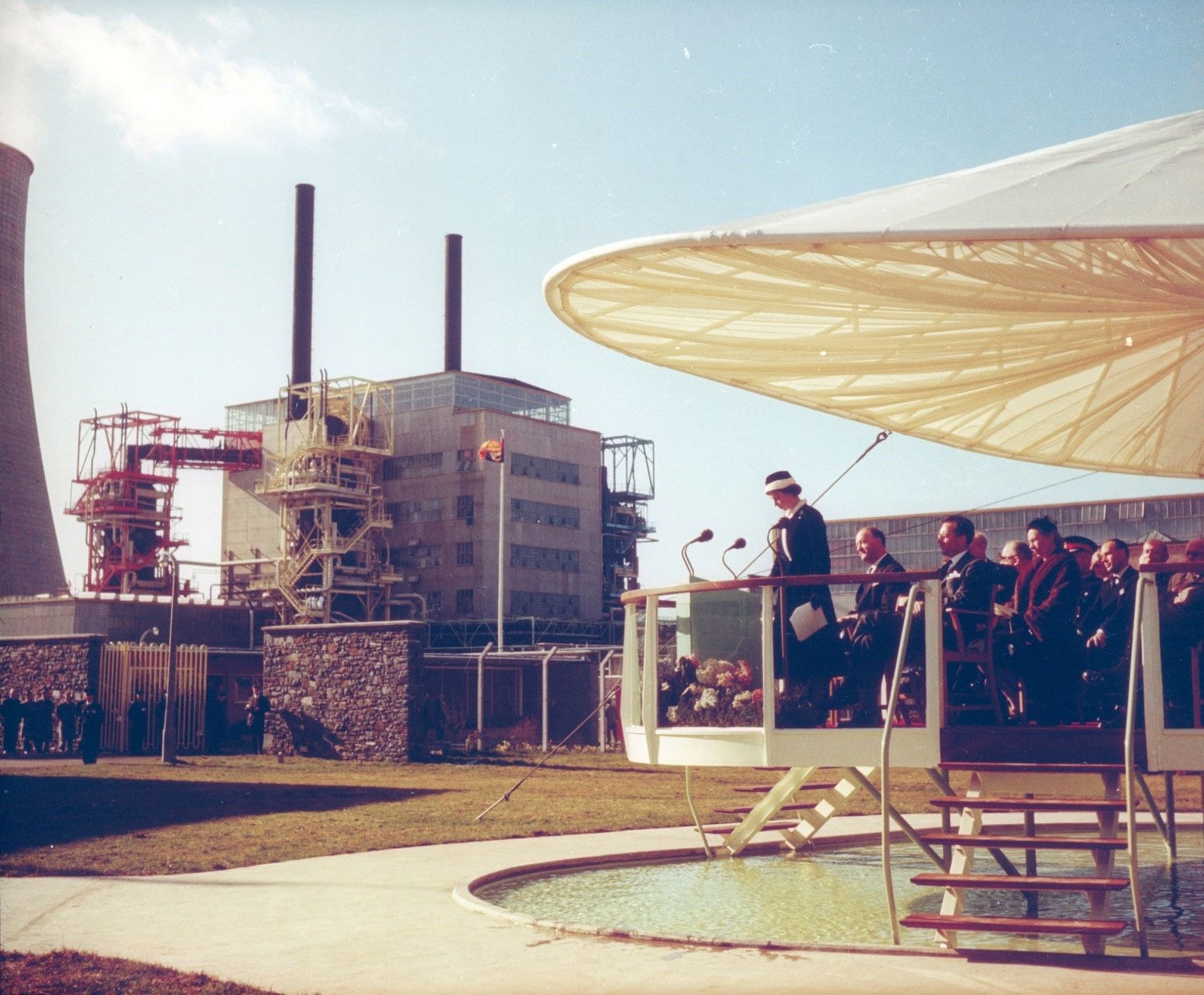 Fig. 1. Queen Elizabeth II opening Calder Hall, the world’s first commercial nuclear reactor, in 1956. (Photo: Sellafield)