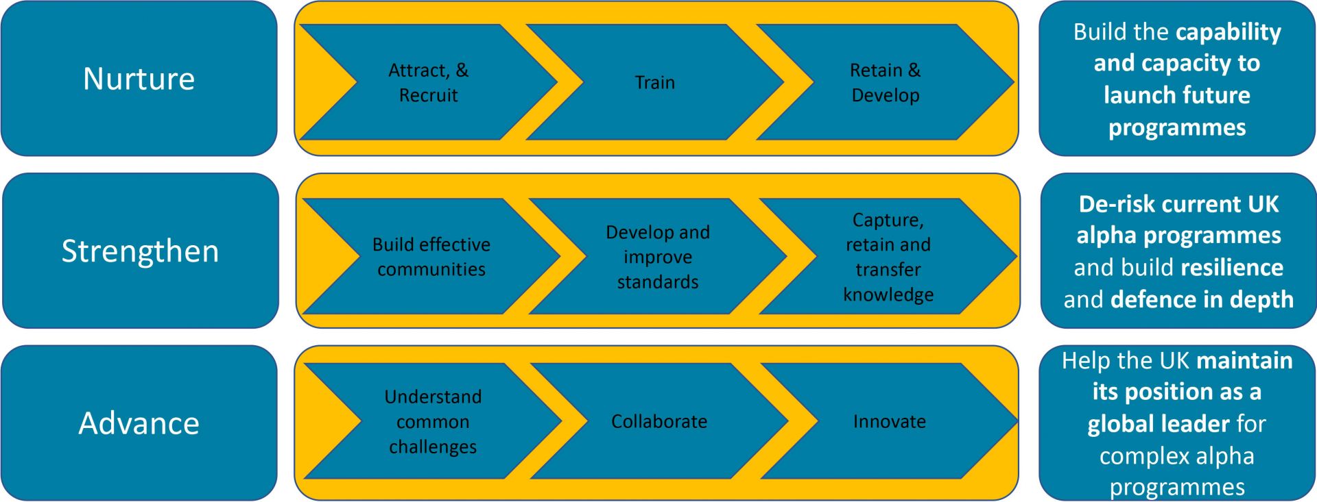 The ARC Programme has identified that there are limited training facilities for alpha skills development. The training, where provided, has a heavy reliance on learning on the job, which means that becoming an SQEP has taken an extended amount of time and increased levels of supervision. A small number of experts have been relied on to provide and deliver the training. Each individual organization has been following its own training specification with no coordination or adoption of national standards.
