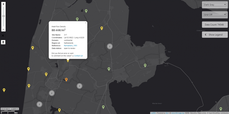 Screenshot of Global Heat Flow data in the region of North Holland, Netherlands (source: IHFC)