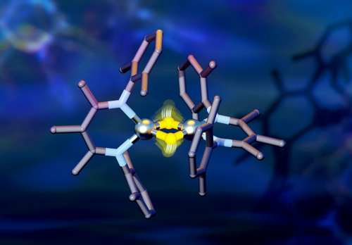 Even small movements of hydrogen, shown in yellow, were found to cause large energy shifts in the attached iron atoms, shown in silver, which could be of interest in creating novel chemical reactions. Credit: Jill Hemman/ORNL, US Dept. of Energy
