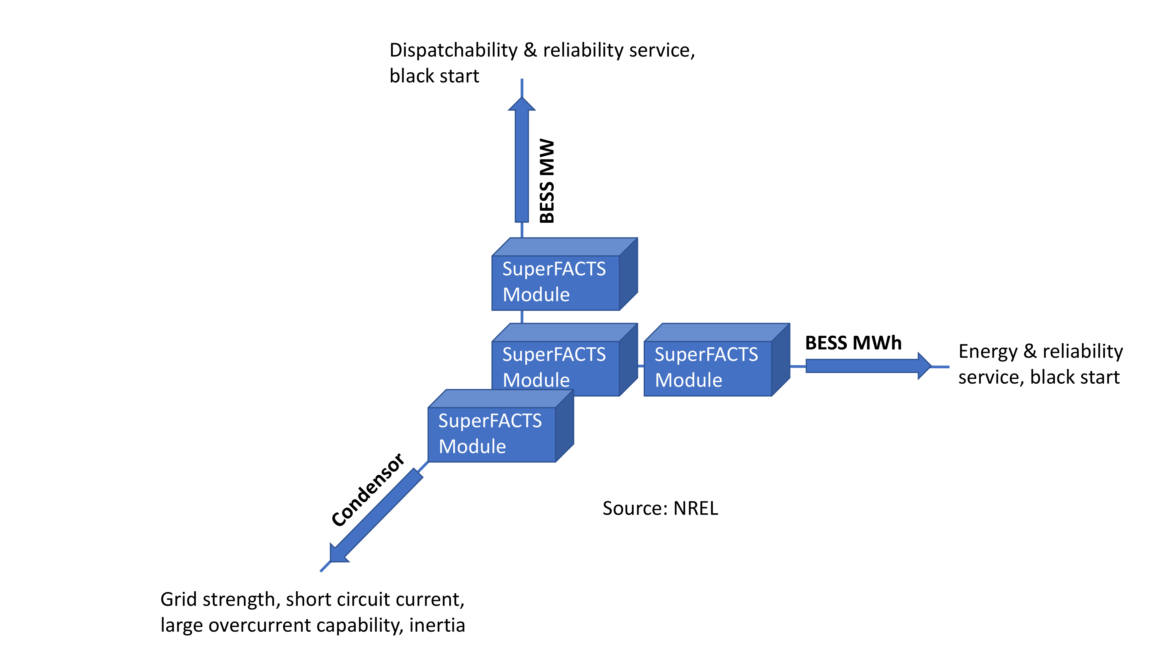 Black-start capability is provided by the BESS grid-forming inverter. This first establishes the local grid to which the SC is synchronized. The SC then adds fault current capability and voltage and frequency stability as the larger grid is restarted and built up by adding additional power generation and loads.