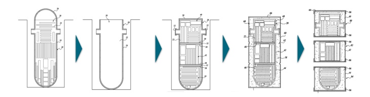The solid, grout-filled reactor vessel packed with waste is subsequently segmented into three large sections, consistent with the optimised waste distribution. Each section is packaged and shipped individually in a tailor-made container designed to safely transport and dispose of the waste in compliance with relevant regulations, and the disposal site's waste acceptance criteria.
