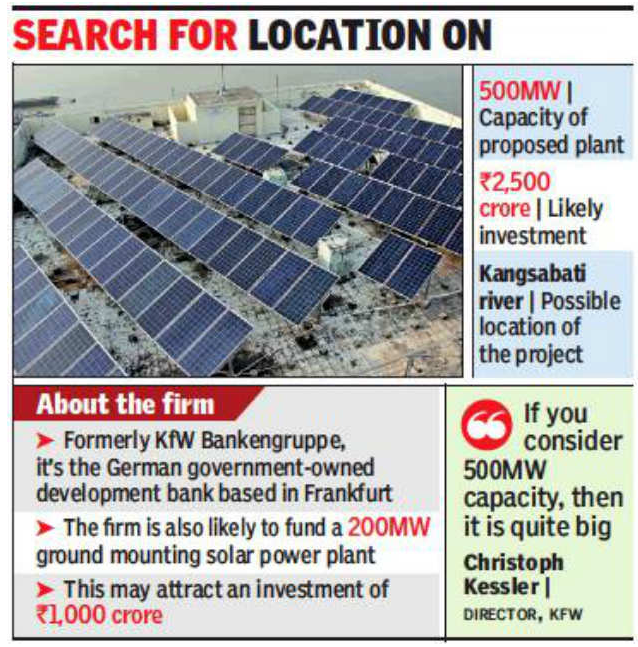 KfW, a source said, may also fund a 200MW ground mounting solar power plant in the state that might attract an additional investment of Rs 1,000 crore. Director of KfW, Christoph Kessler, told TOI that the project was big. “If you consider 500MW capacity, then it is quite big,” he said.