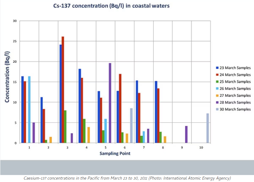 In 2011, a survey conducted by the IAEA found high concentrations of caesium-137 in seawater 10 to 30 kilometres off the Japanese coast, from March 23 to March 30.