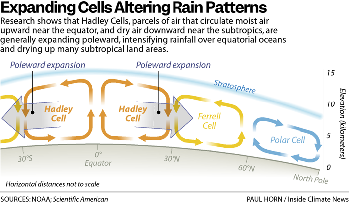 In most parts of the world, the stable bubbles are shifting poleward, heating and drying larger expanses of land in regions like northern Africa, Southern Europe, parts of Mexico and the Southwest U.S. Climate scientists have known this, and warned about it, at least since 2004, when NOAA scientist Xiao-Wei Quan and his team wrote that the shift is associated with “increased equatorial oceanic rainfall, and a general drying of tropical/subtropical landmasses.”