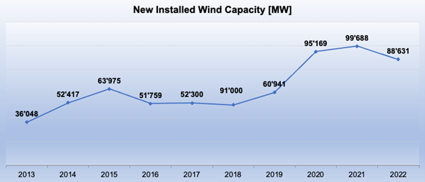 Delays across the globe result in the lowest growth since 2019. 88,6 Gigawatt of additional capacity added in 2022, equaling a growth rate of 10,5%, after 13,4% in 2021. Global wind power capacity stands at 934 Gigawatt – 1000 Gigawatt expected to be exceeded in 2023.