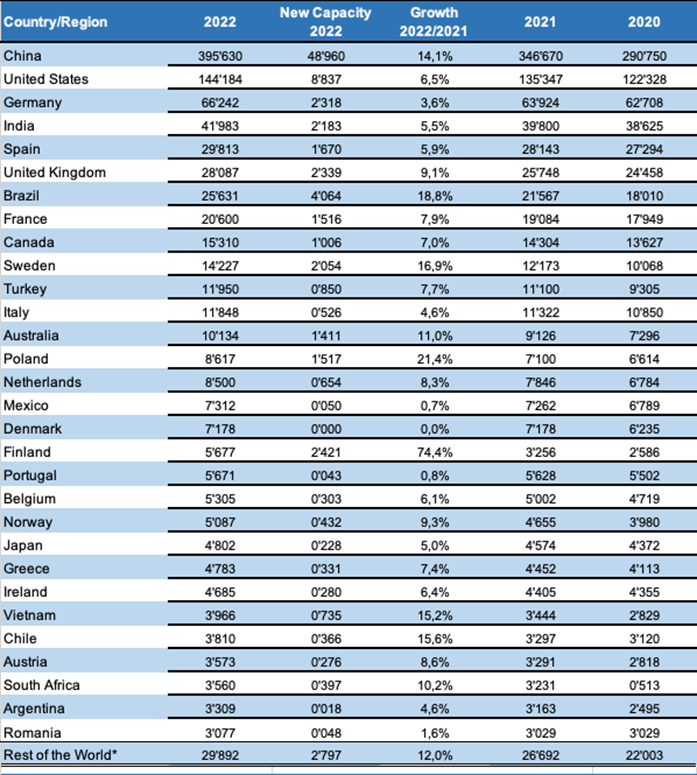 Europe has a new leader in terms of new installations: Finland added 2,4 GW in 2022, followed by the United Kingdom and Germany which have shown very similar growth, each adding 2,3 GW. Sweden added 2 GW, Spain 1,7 GW, followed by France and Poland, which both installed 1,5 GW.