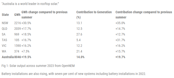 The Clean Energy Council shared the summer statistics, and highlighted the total output for rooftop solar across summer 2023 was 8046GWh – up by 19.5 per cent compared to summer 2022.