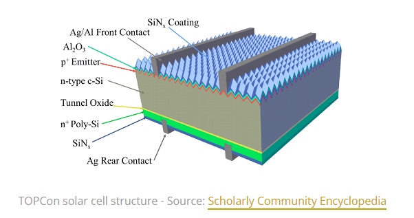 The TOPCon solar cell structure takes the base structure of the PERT solar cell but includes an ultra-thin silicon dioxide (SiO2) layer working as the tunnel oxide layer and replaces the back surface field layer with phosphorous-doped polycrystalline silicon (n+ Poly-Si) layer. These modifications have improved the efficiency by reducing the recombination process thanks to the passivation in the added layers.