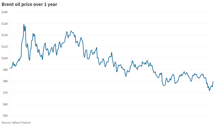 The international benchmark was last trading at $79.89 a barrel on Friday after surging to nearly $140 last year following Russia’s invasion of Ukraine.