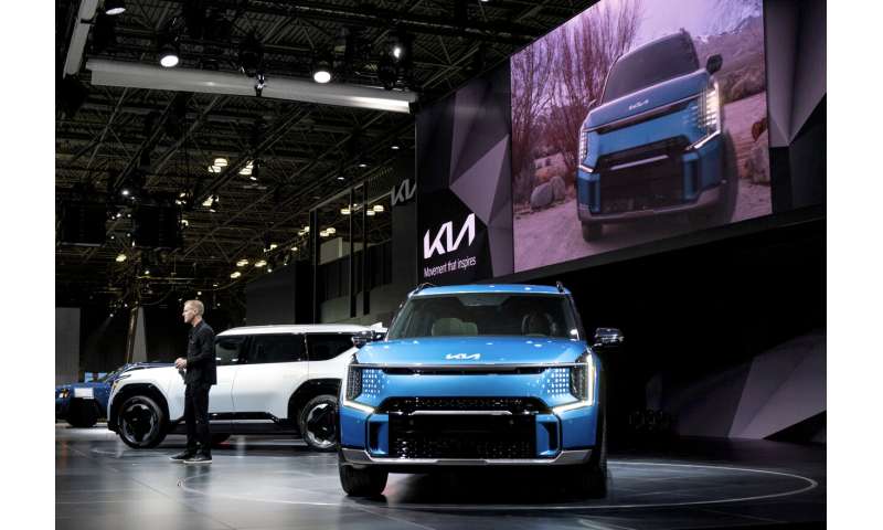 An electric Ram pickup truck with up to 500 miles of range per charge and a battery-powered people-hauling Kia SUV are among the new vehicles being introduced Wednesday at the New York International Auto Show.