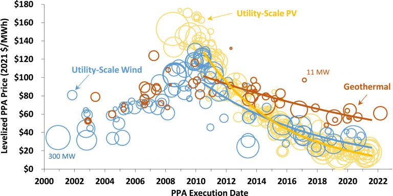 The prices at which power generated by renewable sources are sold at are mostly determined through Power Purchase Agreements (PPA). A fixed-price revenue helps de-risk renewable projects and attract investment, particularly for capital-intensive facilities. The study draws upon extensive databases by the Berkeley Lab of historical PPA prices for wind, solar, and solar+storage. These were then supplemented with a new database of geothermal PPAs.