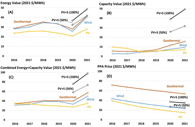 Historical energy value (A), capacity value (B), combined energy and capacity value (C), and PPA prices (D) of PV, wind, geothermal, and PV + S in the Western US. (Bolinger et al., 2023)