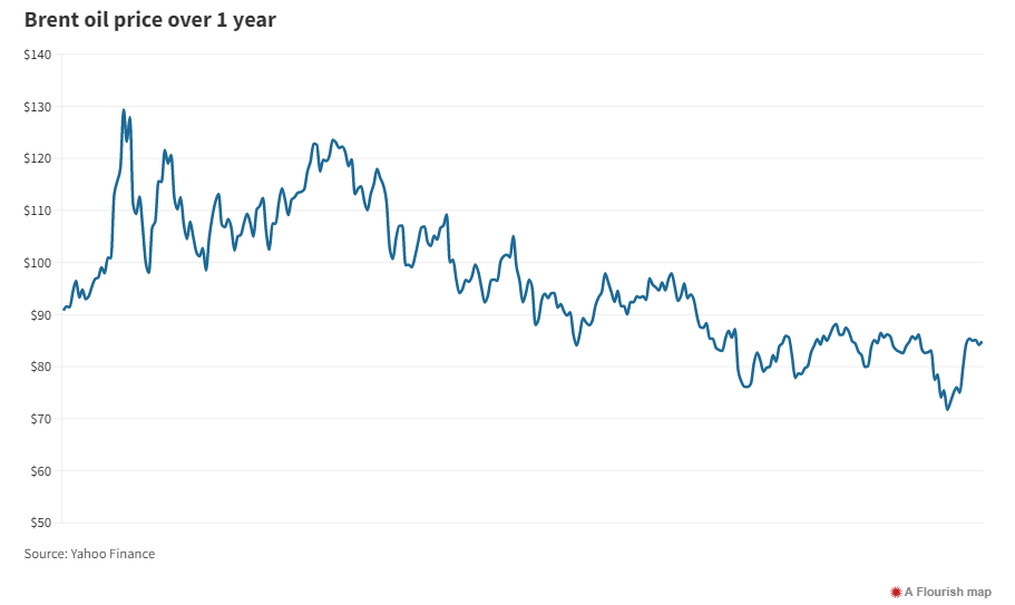 Brent, the benchmark for two thirds of the world’s oil, settled 1.7 per cent higher at $85.61 a barrel at the close of trading on Tuesday. West Texas Intermediate, the gauge that tracks US crude, closed up 2.2 per cent at $81.53 a barrel.