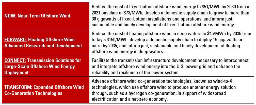 DOE’s strategy is structured around four major initiatives that seek to, among other things, reduce costs, spur supply chain development, achieve equitable and sustainable development, develop transmission solutions for large-scale offshore wind, enhance grid reliability and resilience, and promote offshore wind co-generation.