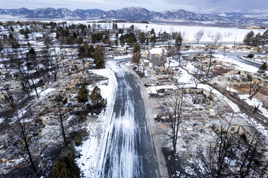 In this aerial view, burned homes sit in a neighborhood decimated by the Marshall Fire on Jan. 4, 2022 in Louisville, Colorado. Credit: Michael Ciaglo/Getty Images