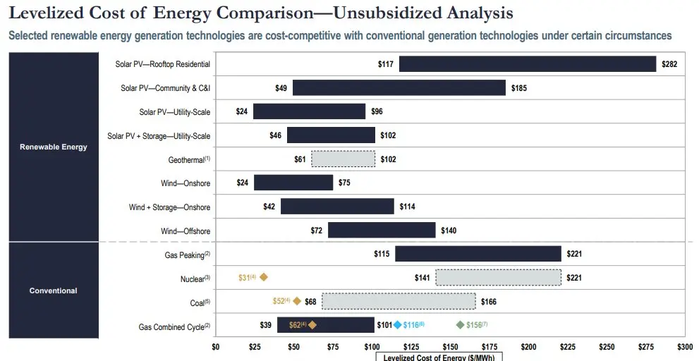 Lazard, which specializes in financial advice and asset management, conducts a regular revue of what is known in the utility industry as the levelized cost of energy. For those who may not know exactly what that means, here is how the folks at Wikipedia explain it: