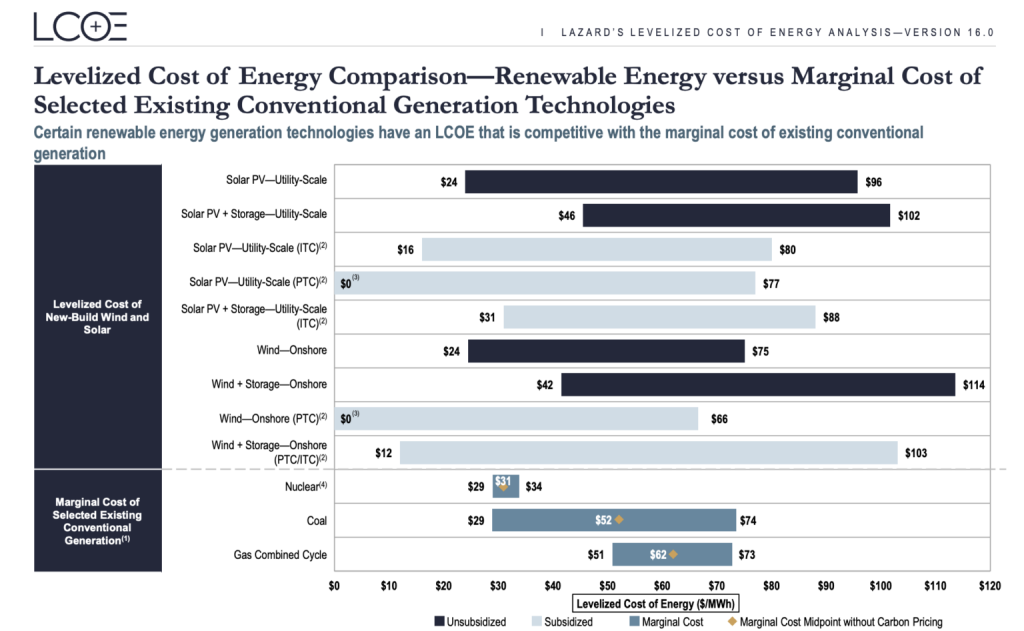 The Lazard assessment shows that by virtually any assessment — cost of energy, cost of energy and firming, marginal cost of energy, and cost of capital — wind and solar win easily. And that’s without counting the carbon cost of their competitors and the impact of the Joe Biden’s Inflation Reduction Act, which has added tens of billions of new financial incentives to the mix.