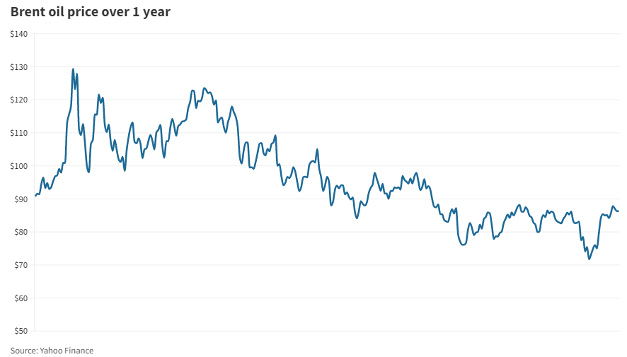 Brent, the benchmark for two thirds of the world’s oil, was trading 0.44 per cent lower at $85.93 a barrel at 3.52pm UAE time. West Texas Intermediate, the gauge that tracks US crude, was down 0.48 per cent at $82.42 a barrel.