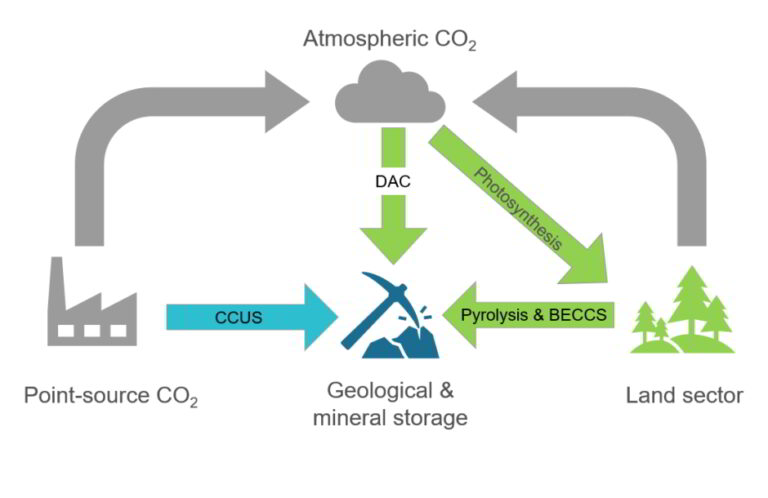 Avenues of carbon sequestration. Emissions (sources, flows and stocks) are represented in grey. The grey cloud represents emissions from all sources and sectors. Arrows indicate how carbon is captured. Icons indicate where carbon is stored. CCUS is represented in blue and CDR in green; Source: CCA